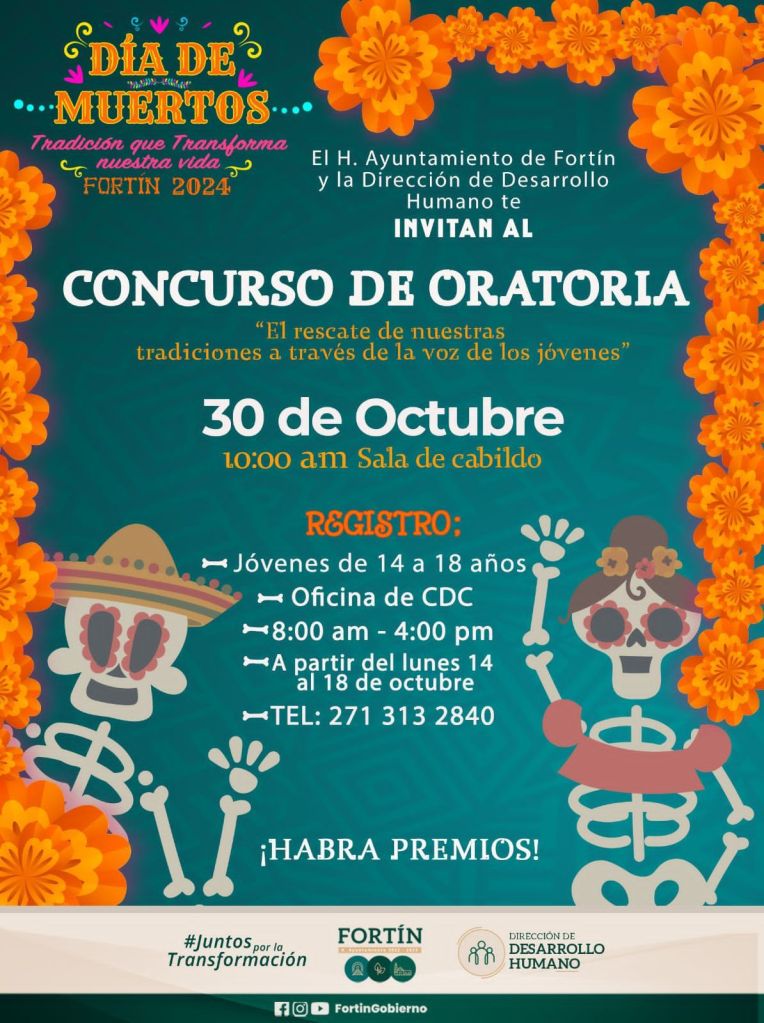 ⚰️🪦💐 El H. Ayuntamiento de Fortín y la Dirección de Desarrollo Humano invitan a las y los jóvenes entre 14 y 18 años a participar en el Concurso de Oratoria “Rescatando mis Tradiciones: Día de Muertos”, el cual tiene como objetivo el rescate de nuestras tradiciones a través de los jóvenes. ⚰️🪦💐