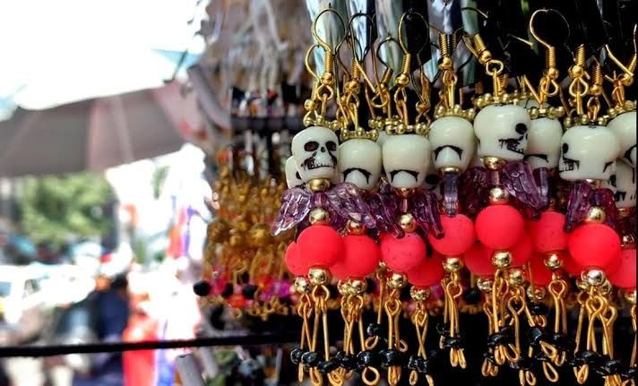 Con motivo del Día de Muertos se aprecian cortinas alusivas a la ofrenda, aretes de catrinas, pulseras con figuras de cráneos, moños, flores sintéticas de cempasúchil, sets de maquillajes y velas de plástico con luz led, todo de origen chino.