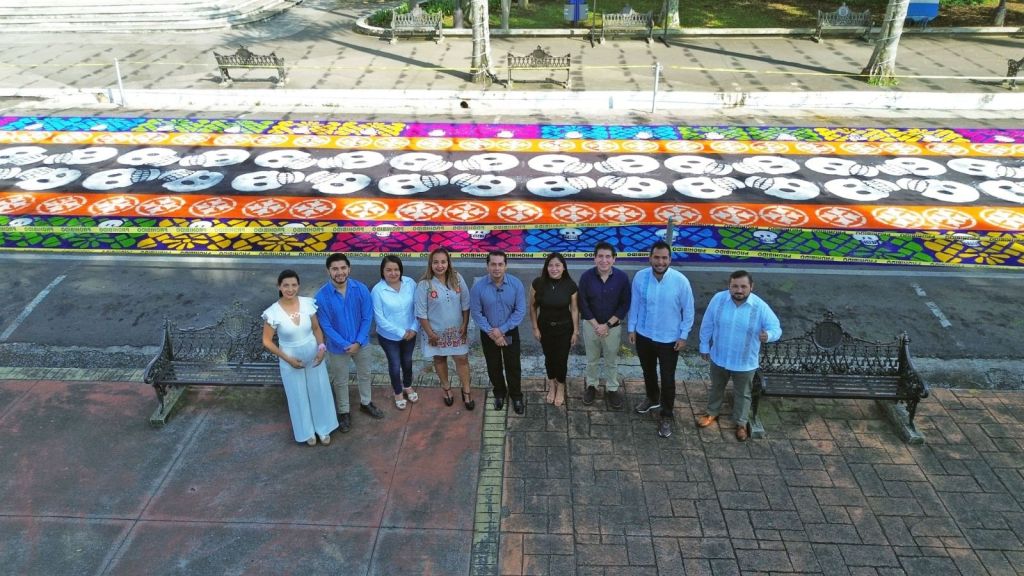 La avenida 3 entre calles 1 y 3, tiene un colorido especial para recibir a cientos de visitantes durante estos días de tradición de Todos Santos, a partir de hoy y hasta el sábado 2, permanecerá expuesto un tapete de aserrín que representa la tradición del municipio de Tlaxcala y plasma un camino de calaveras, simulando el regreso de las almas de los fieles difuntos como parte del misticismo durante esta época.