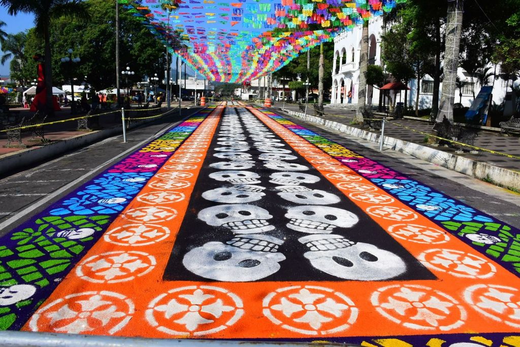 Fortín, Ver – Con gran atractivo en conmemoración al Día de Muertos, luce el centro de Fortín, y gracias al respaldo del presidente municipal Gerardo Rosales Victoria se colocó un tapete de aserrín elaborado por artesanos de Huamantla, asimismo, los atractivos se complementan con grandes catrinas y la exposición de altares en el parque Lázaro Cárdenas.