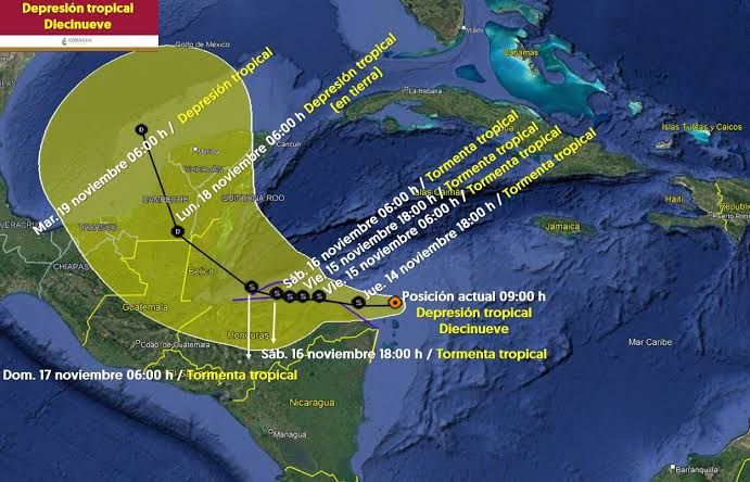La tormenta se desplazaría este viernes sobre Honduras, después ingresaría a Belice el domingo y, al final, atravesaría Campeche como depresión tropical, según la trayectoria prevista por el SMN.