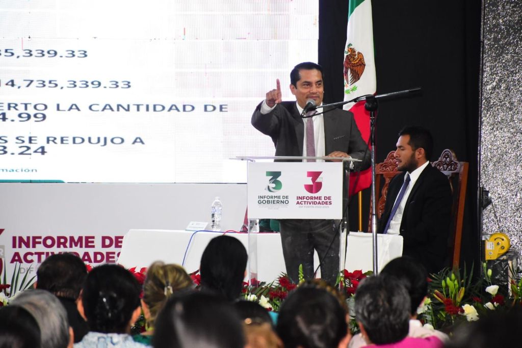 El presidente municipal Gerardo Rosales Victoria rindió su tercer informe de Gobierno en el que destacó la reducción de la deuda heredada desde hace 14 años, así como el impulso al sector campesino, de igual manera la ejecución de 81 millones de pesos para obra pública durante este 2024.