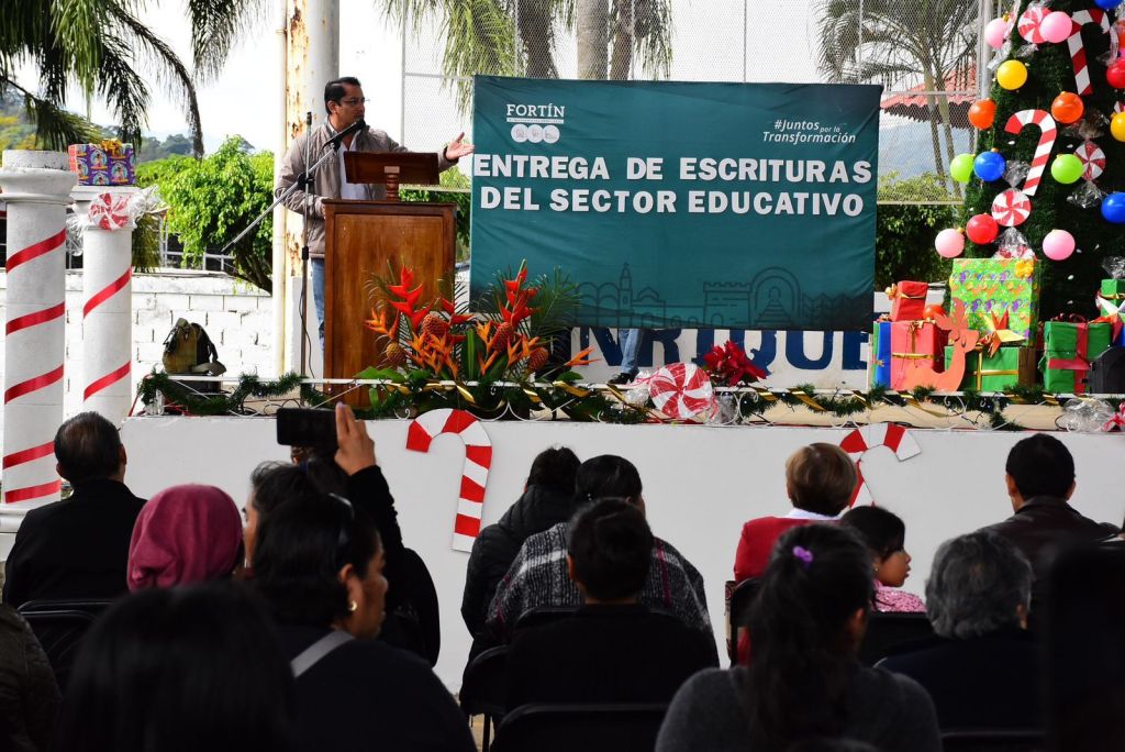 “Estamos siendo testigos de la entrega de escrituras, que da certeza a nuestros alumnos y esos alumnos que están en un futuro serán los papás y recordaran con cariño lo que ustedes como padres, como hermanos, como autoridades educativas y de gobierno hemos hecho para construir un mejor Fortín, un mejor municipio para nosotros”, puntualizó el Presidente Municipal, Gerardo Rosales Victoria. Las escuelas beneficiadas fueron: primaria Lázaro Cárdenas de la localidad de Zapoapita, primaria Rafael Ramírez de la localidad de San Martín, Secundaria Enrique C. Rébsamen, Telebachillerato San José, CETis 143, jardín de Niños Leona Vicario de San Basilio, primaria Miguel Hidalgo de Monte Blanco, primaria Leona Vicario de San Marcial, DIF Santa Leticia.