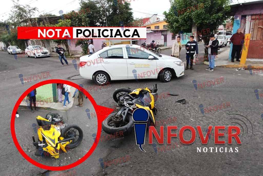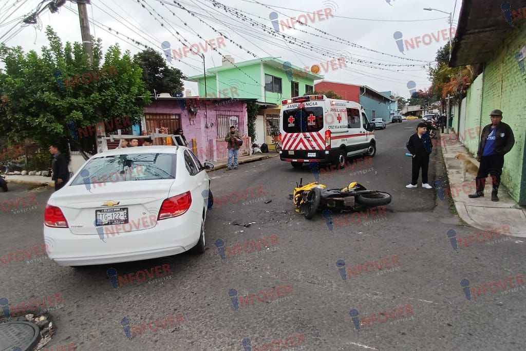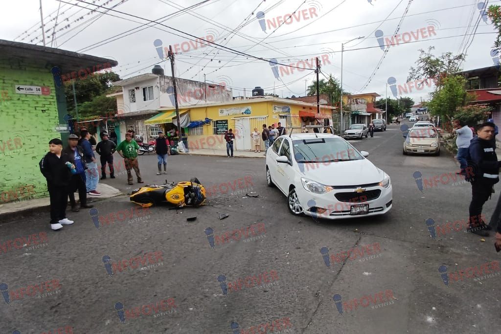 Córdoba, Ver.- La tarde de este Jueves un joven motociclista resultó gravemente lesionado, luego de que presuntamente se impactara contra un vehículo Chevrolet con razón social a nombre del grupo -Carso- debido a que el conductor de la segunda unidad aparentemente no realizó alto total ni respetó los señalamientos de vialidad en el cruce de la avenida 14 con calle 14 en la colonia Los Filtros.