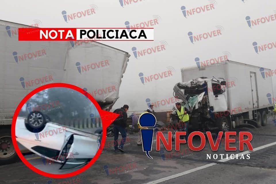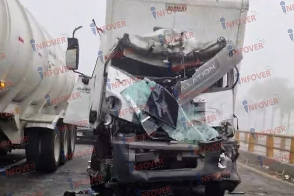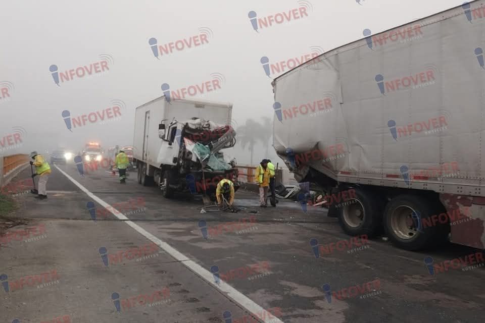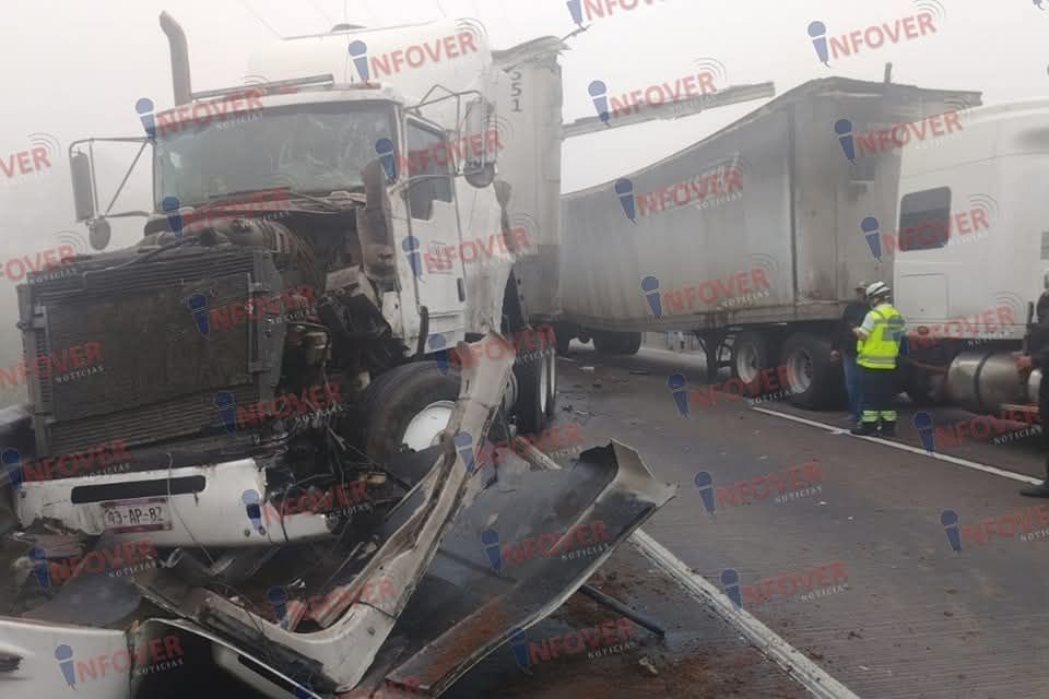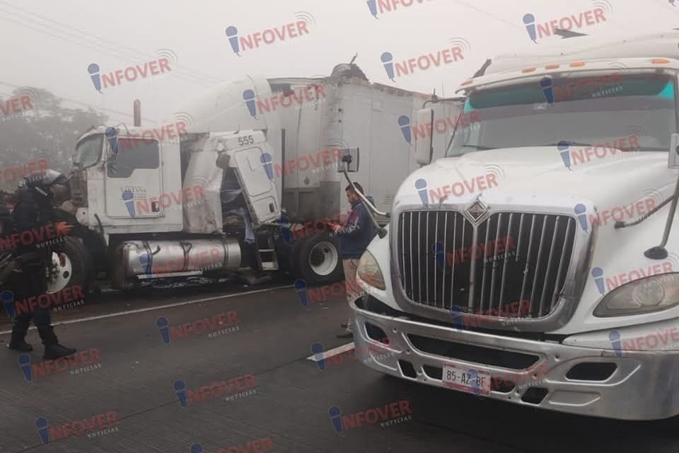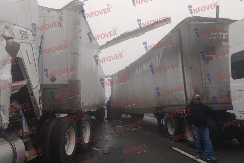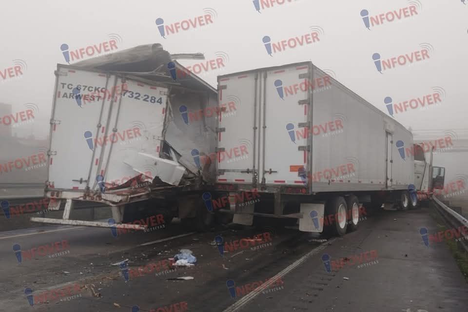 Y finalmente justamente en el puente de la universidad Anáhuac, dos tráilers chocaron de costado, esto por la falta de visibilidad y el exceso de velocidad, impidieron que las pesadas unidades frenarán con anticipación y se golpearán de costado, dejando a uno de los vehículos desbaratado al ser empujado hacia su costado derecho.