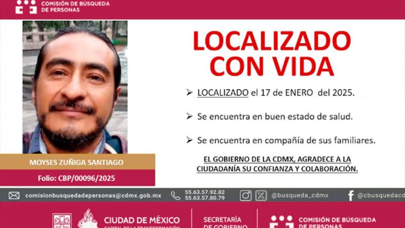 Anny Zúñiga Santiago, hermana del fotógrafo, publicó en sus redes sociales la ficha de la Comisión de Búsqueda de Personas de la Ciudad de México en donde se informa del hallazgo. “Gracias a todas y todos”, publicó junto a la ficha de búsqueda que expone que localizaron con vida a Moysés este 17 de enero tras una campaña en redes sociales del gremio para encontrarlo.