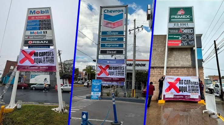 En las últimas semanas, Profeco ha colocado sellos de advertencia en gasolinerías del país y una lona con la leyenda No cargues aquí, se vuelan la barda con los precios.