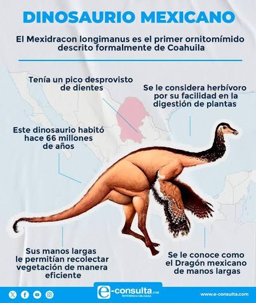 Se estima que vivió hace 72 millones de años. El Mexidracon longimanus pertenece a los terópodos, dinosaurios ligeros, así como a los ornitomímidos, muy parecidos a las avestruces.