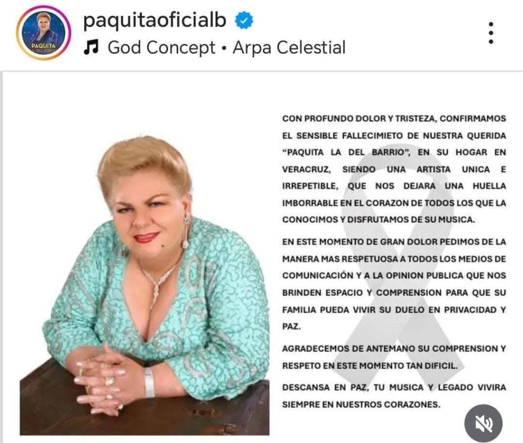 || Tras complicaciones de salud, la reconocida cantante que le cantaba a los hombres infieles Paquita la del Barrio falleció este lunes 17 de febrero de 2025 a los 77 años años de edad, la noticia fue dada a conocer a través de redes sociales oficiales