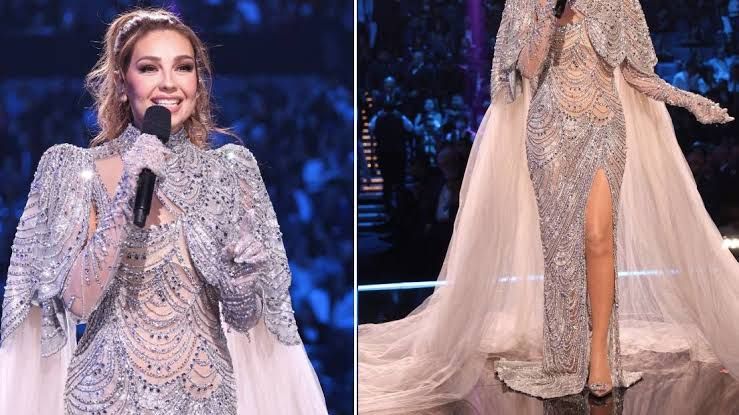 Para la noche de los Premios lo Nuestro 2025, la intérprete de Marimar lució diferentes cambios de looks, pero si hay un estilismo que primero hay que mencionar, es el que llevó en su paso por la alfombra rosa. Thalia deslumbró con un vestido de JoliPoli Couture, una firma de la diseñadora vietnamita Phạm Đăng Anh Thư. El diseño de vestido joya revelaba un escote Bardot pronunciado que llegaba a la altura de la cintura. La silueta, ceñida por la cintura y la cadera, mostraba pliegues cruzados para finalmente dejar caer la falda fluida. Los estilistas de moda detrás de su look fueron Irma Martínez y Gigi. Si bien el vestido en sí mismo ya era una declaración de brillo, la actriz mexicana complementó con joyería aún más brillante de JJ Jewelry, una firma con sede en Miami. Sus zapatos de plataforma en color plata eran de Miu Miu. Thalia elevó el glamour con un peinado de ondas hacia las puntas y un maquillaje que coordinaba con el vestido.
