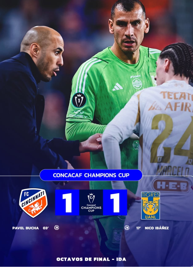 Tigres UANL igualó 1-1 ante Cincinnati en la ida de los Octavos de Final de la Copa de Campeones de la Concacaf 2025, en el debut de Guido Pizarro como entrenador del equipo felino tras su reciente retiro como jugador.