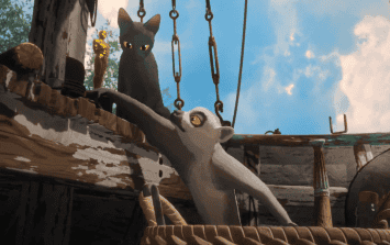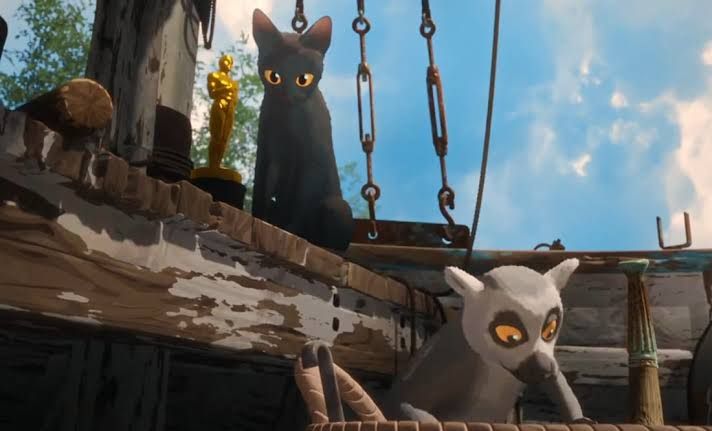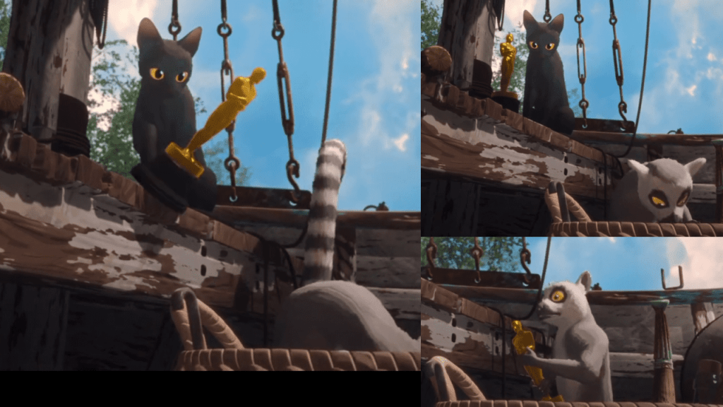 Sin embargo, el protagonista de la cinta, el gatito negro, pasa de lado y tumba el trofeo al suelo. De inmediato, el lémur lo recoge y le gruñe al gato.
