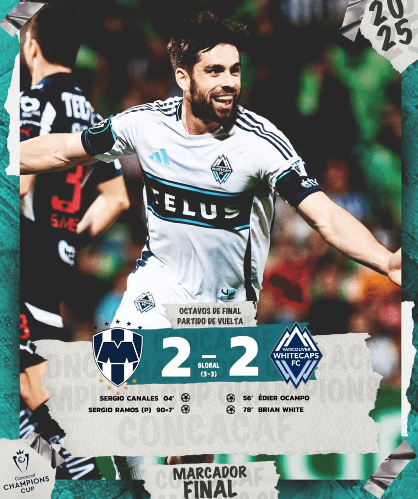 Los Rayados de Monterrey se fueron al frente en el marcador con gol de Sergio Canales al minuto 4, mientras que los Whitecaps le dieron la vuelta con anotaciones de Ocampo y White. Al 90+5′, Sergio Ramos hizo su segundo gol con los regios desde los once pasos, sin embargo no fue suficiente y los dirigidos por Martín Demichelis hicieron tremendo papelón aún con su poderosa plantilla.