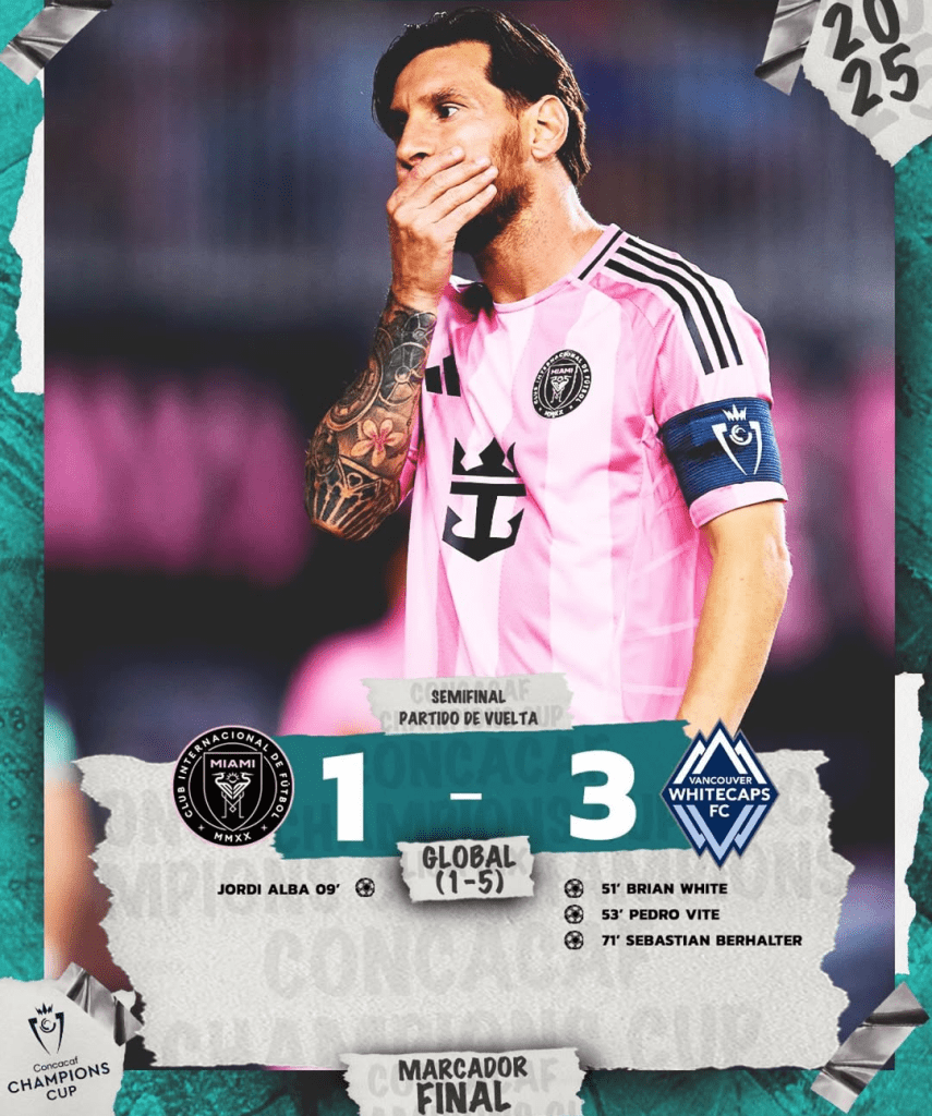 Vancouver Whitecaps no sólo echó abajo los pronósticos, también se dio el lujo de humillar y golear 3-1 (5-1, global) al Inter Miami de Lionel Messi en el Chase Stadium, para meterse a la final de la Concacaf Champions Cup 2025.