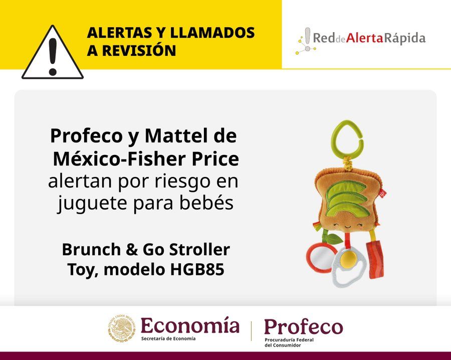 La Procuraduría Federal del Consumidor (Profeco) y la empresa Mattel alertaron sobre un posible riesgo de asfixia asociado al juguete ‘Brunch & Go Stroller Toy’, modelo ‘HGB85’, de la marca Fisher-Price, por lo que más de cuatro mil unidades serán retiradas del mercado.