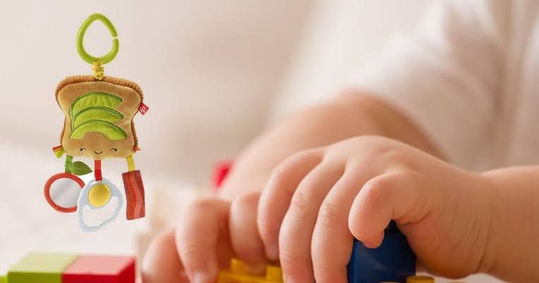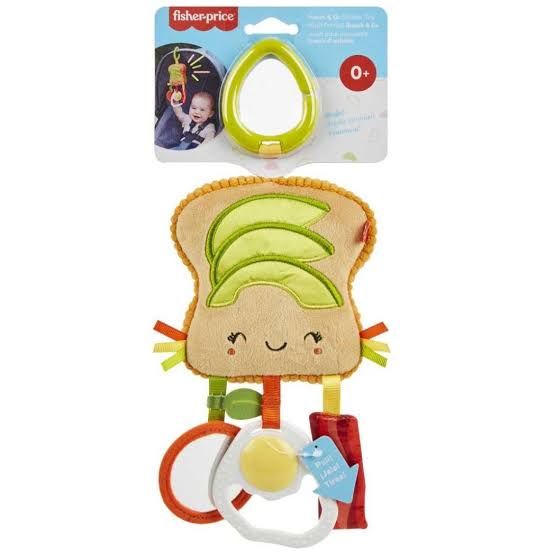 Este juguete, que puede colgarse de una carreola, mochila y otros muebles para bebé, cuenta con una tostada de aguacate falsa y tres accesorios: un tomate espejo, un tocino arrugado y un mordedor de huevo, éste último el principal problema.