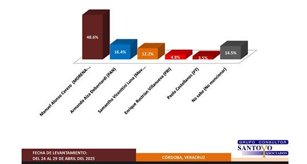 Córdoba, Ver – El Candidato de Morena-PVEM a la Presidencia Municipal de Córdoba, Manuel Alonso Cerezo, arrancó la campaña con una amplia ventaja (de 3 a 1) sobre sus oponentes, contando con el 48.6% de la preferencia electoral de los cordobeses, según la encuesta realizada del 24 al 29 de abril por el Grupo Consultor Santoyo y Asociados. En sus primeros 7 días de campaña, el candidato de la #4T ha desarrollado una intensa presencia en las colonias, comunidades y sosteniendo encuentros con grupos sociales de la ciudad, para presentar su plan de gobierno y destacando que el suyo será “un buen gobierno, con capacidad, visión y liderazgo que atienda a la ciudadanía de verdad”, acrecentando así su aceptación entre el electorado. Según el estudio del Consultor Santoyo, Manuel Alonso, candidato de MORENA-VERDE ECOLOGISTA, tiene el 48.6% de la preferencia electoral, seguido del candidato del PAN, Armando Aíza con el 16.4% y el Movimiento Ciudadano con Samatha Vicenttin tiene el 12.2%.