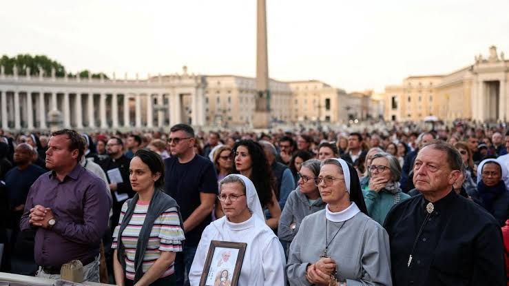 Varios miles de personas, entre fieles y curiosos, se congregan ya en la plaza de San Pedro del Vaticano poco después del comienzo del cónclave en el que se buscará al sucesor del papa Francisco, a la espera de la primera fumata.
