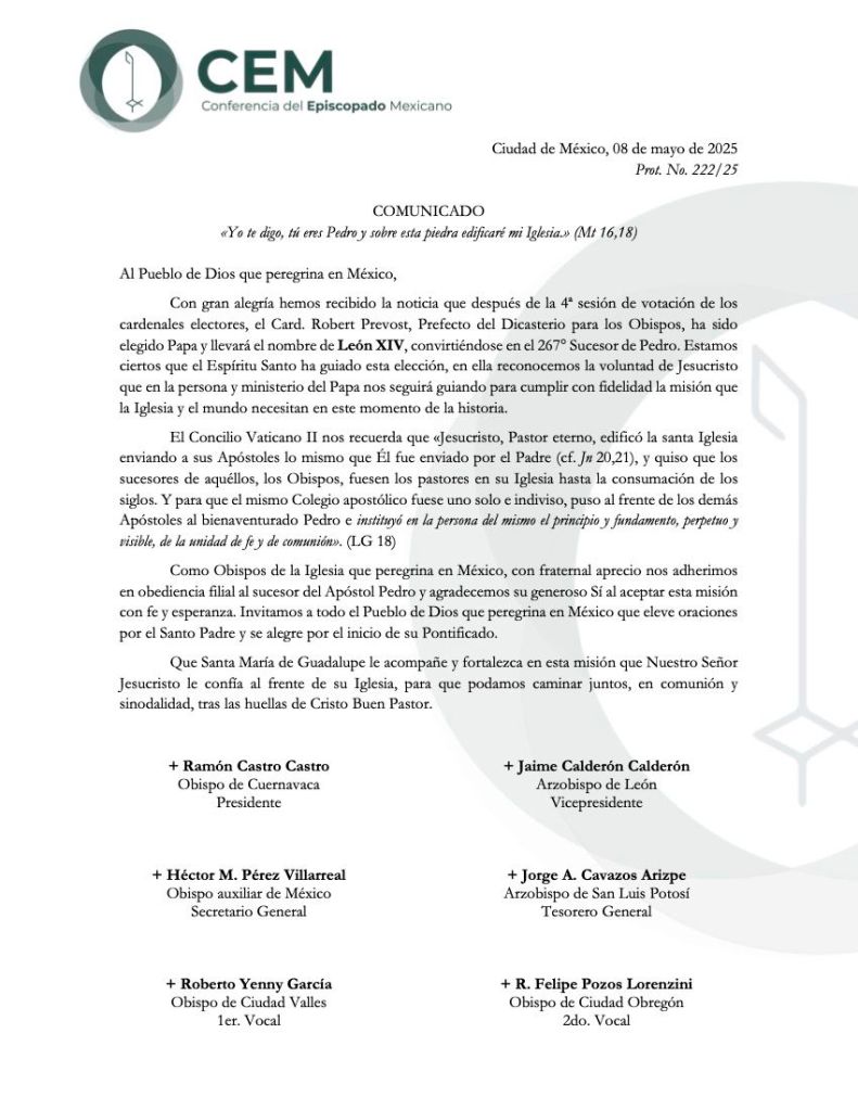 En un comunicado, la CEM externó su obediencia filial al nuevo papa, a quien agradeció el aceptar la misión con fe y esperanza.