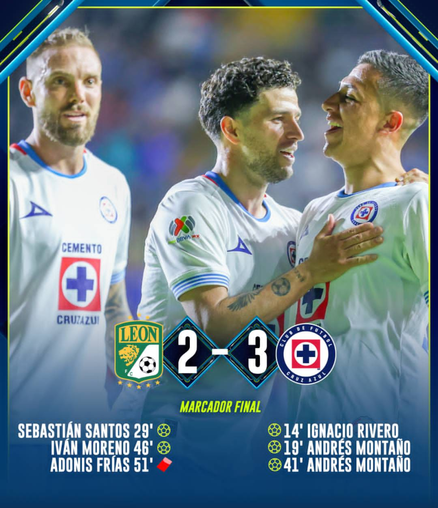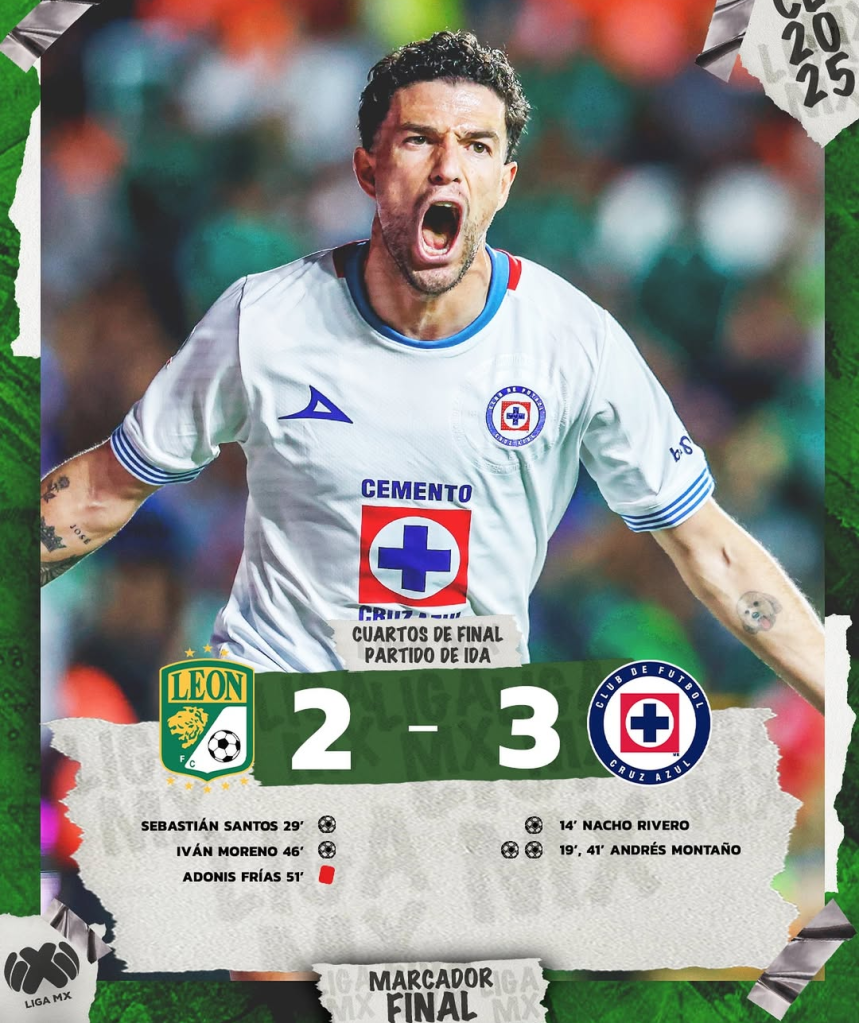 Cruz Azul salió con ventaja de la ida de los cuartos de final contra León en el Nou Camp. La Máquina venció 2-3 a los esmeraldas en el primer capítulo de la serie, con Andrés Montaño como figura, luego de que el ‘10’ de la Máquina hizo un doblete, además de un tanto de Ignacio Rivero contra la Fiera, que jugó 40 minutos con un hombre menos ante la expulsión de Adonis Frías.
