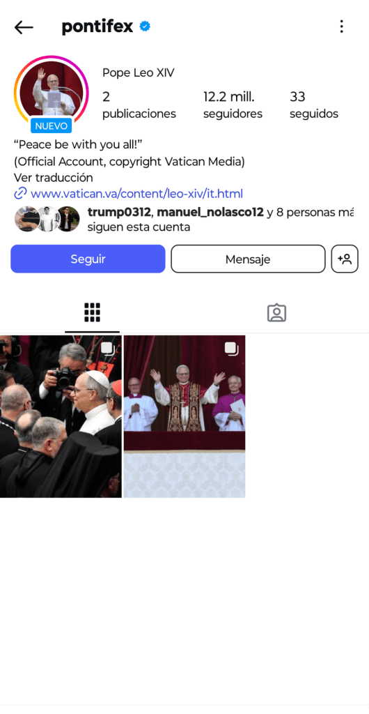 En el caso de Instagram se creó una única cuenta que ya tiene más de 1.5 millones de seguidores. En la misma, el Santo Padre realizó su primera publicación y compartió varias fotos de los últimos días en el Vaticano, incluyendo imágenes del pasado jueves 8 de mayo en su discurso tras el cónclave, su visita a la tumba del fallecido papa Francisco en la basílica de Santa María La Mayor y en algunas de las misas realizadas en los días previos en la Capilla Sixtina.