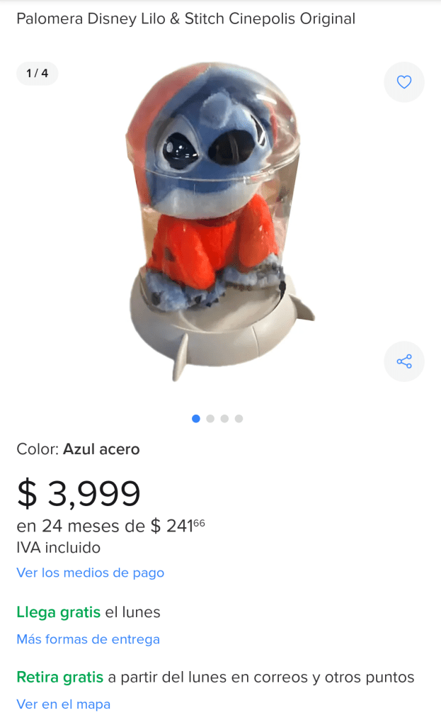 Por ejemplo, la palomera de Lilo & Stitch de Cinépolis una cápsula transparente con un peluche del personaje dentro tenía un precio oficial en salas de $639 pesos. Sin embargo, al agotarse rápidamente, comenzó a aparecer en internet revendida por precios que van desde los mil $3,500 hasta los $4,000.