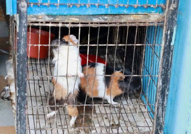 Durante la inspección se localizaron siete perros atados con correas cortas y sin acceso constante a agua o alimento, además de seis gatos en espacios reducidos. También se encontraron 164 aves distribuidas en jaulas apiladas: 103 gallinas y gallos, 42 codornices, 13 periquitos australianos, 2 canarios, 2 patos y 2 guajolotes, además de dos cuyos y un conejo.