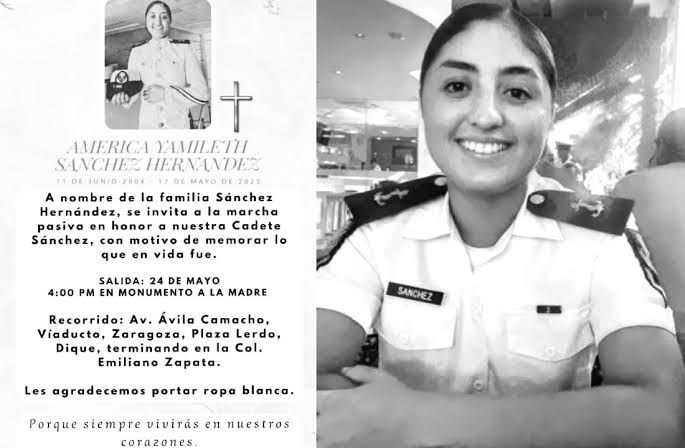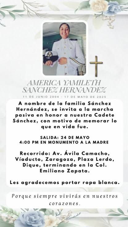 En redes sociales se anunció la realización en Xalapa de una marcha pacífica para hoy 24 de mayo en honor a la cadete América Yamileth Sánchez, fallecida en el accidente del Buque Cuauhtémoc en el puente de Brooklyn en Nueva York.