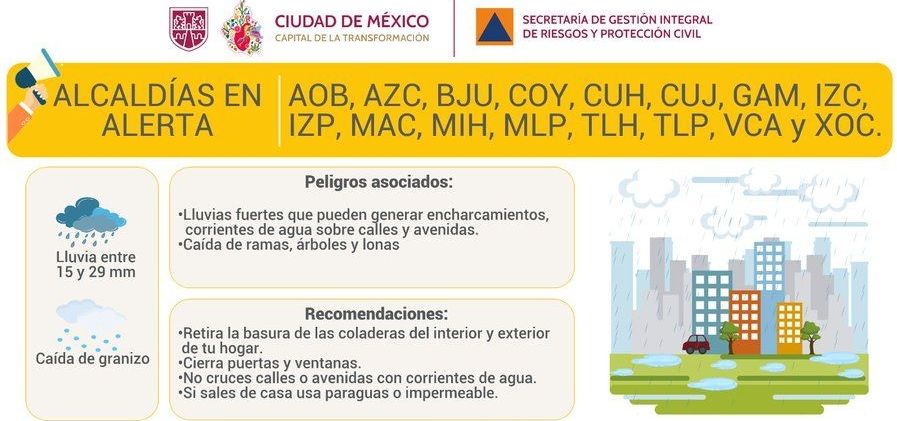 Protección Civil de la Ciudad de México activó la Alerta Amarilla en todas las alcaldías por pronóstico de lluvias fuertes con posible caída de granizo para madrugada del viernes 30 de mayo.