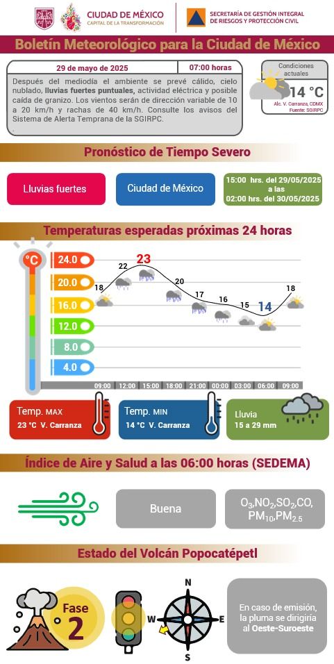 Las lluvias ocasionaron también la caída de árboles y ramas en las alcaldías Azcapotzalco, Venustiano Carranza, Cuauhtémoc y Benito Juárez. Para este jueves, el pronóstico meteorológico prevé un ambiente cálido después del mediodía.