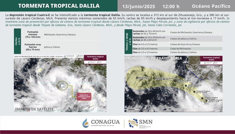 El Servicio Meteorológico Nacional (SMN) detalló que a las 12:00 h de este viernes la depresión tropical Cuatro-E se intensificó a la tormenta tropical “Dalila” en el Pacífico mexicano.