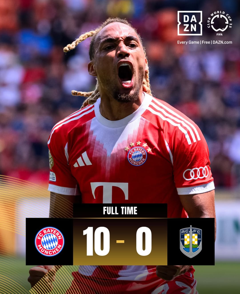 La goleada que firmó el Bayern este domingo se colocó como la más grande en la historia del Mundial de Clubes, pues hasta antes de este juego el triunfo de 6-1 que consiguió Al-Hilal ante AL-Jazira en 2022 era el más amplio que un equipo había conseguido en el torneo organizado por la FIFA, marca que superó por mucho la escuadra alemana