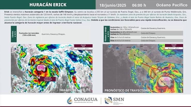 El Servicio Meteorológico Nacional (SMN) prevé que “Erick” evolucione en las próximas horas a huracán de categoría 1 en la escala Saffir-Simpson frente a las costas de Oaxaca.
