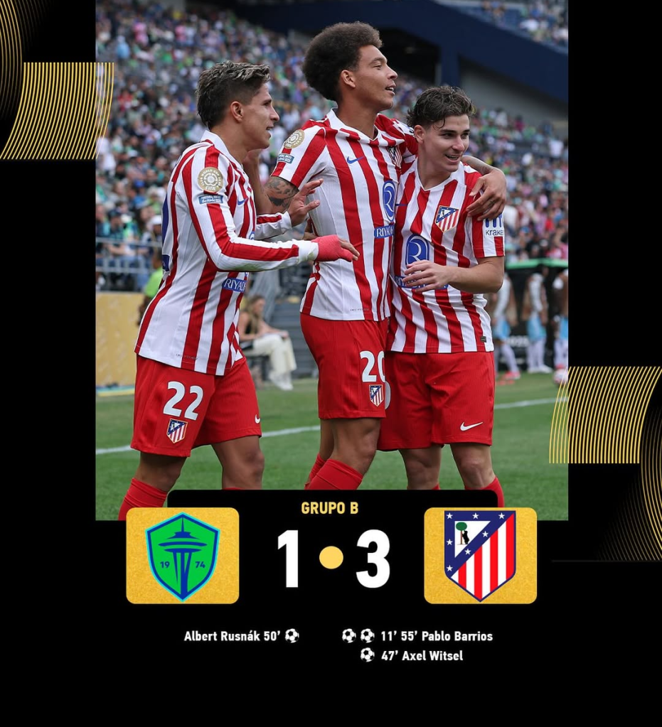 El Atlético de Madrid se ha repuesto de la derrota de la primera jornada ante el campeón de Europa con un triunfo frente al Seattle Sounders gracias a un doblete de Pablo Barrios y a otro tanto de Witsel. Los norteamericanos recortaron distancias por medio de Rusnak y pudieron hacer alguna diana más ante la preocupante endeblez defensiva de los colchoneros, quienes se jugarán su pase a la segunda ronda contra el Botafogo.