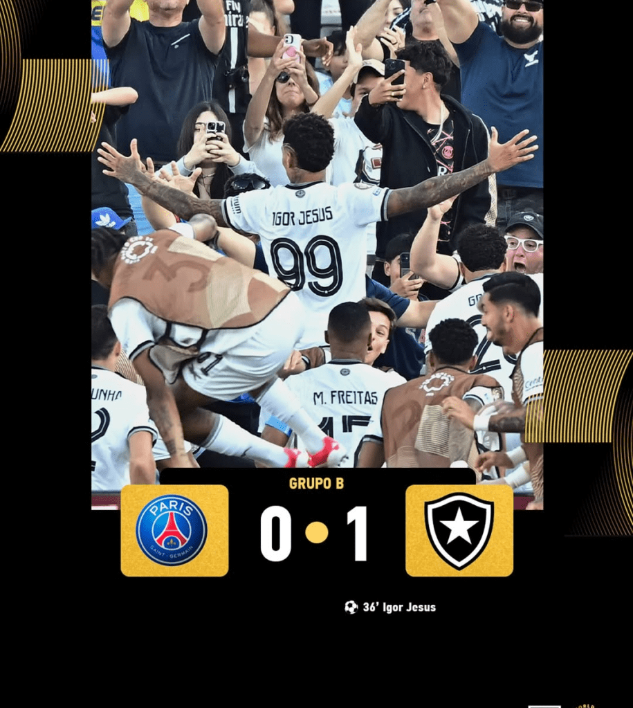 Botafogo dio la primera gran sorpresa del Mundial de Clubes. Los todavía campeones defensores de la Copa Libertadores, dieron un golpe de autoridad al sacar un triunfo frente al actual campeón de Europa, París St. Germain. Con un gol en solitario de Igor Jesus en el primer tiempo, el equipo de Renato Paiva consiguió su segunda victoria del torneo y se afianzaron en lo más alto del Grupo B con seis unidades. Este resultado, prácticamente los pone en la siguiente ronda del torneo.