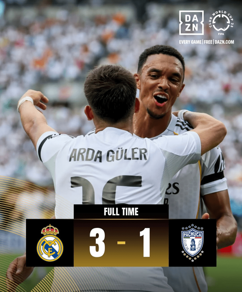 Diez minutos después, el Madrid volvió a dar fe de su gran calidad para tocar el balón y tras otra gran jugada de conjunto, Arda Guler definió cruzado en el área para el 2-0 en Charlotte.