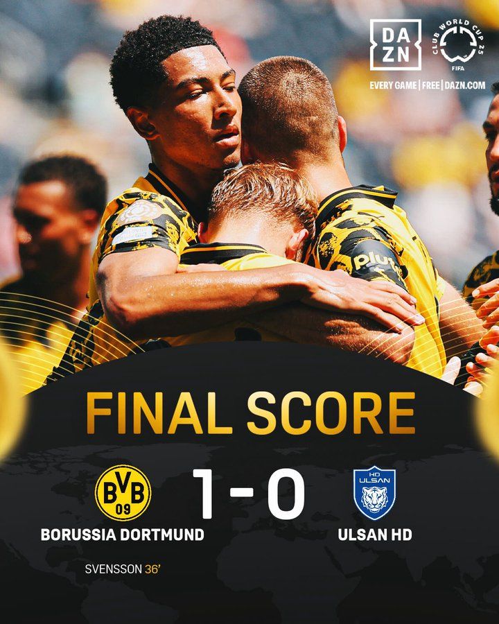 Borussia Dortmund logró clasificar como líder del Grupo F en el Mundial de Clubes tras vencer 1-0 a Ulsan Hyundai, en un partido disputado en el TQL Stadium de Cincinnati. A pesar de no mostrar su mejor rendimiento, el conjunto alemán logró llevarse la victoria gracias a un gol de Daniel Svensson en el primer tiempo y se clasificó a los octavos de final como el equipo mejor ubicado del grupo.