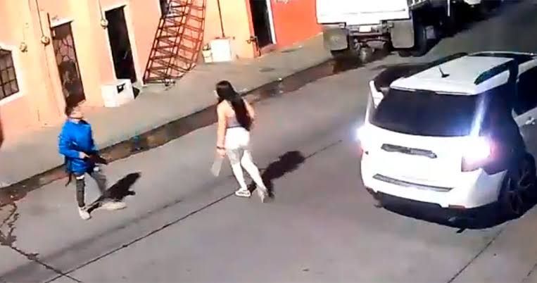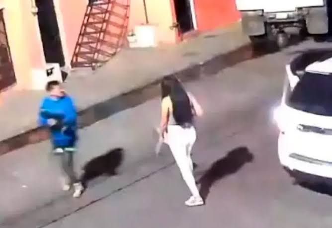Una cámara de seguridad captó el momento en que la mujer, identificada como Karla «N», golpea con una escoba una camioneta detenida en medio de la calle y confronta a un hombre, a quien identifican como su expareja.
