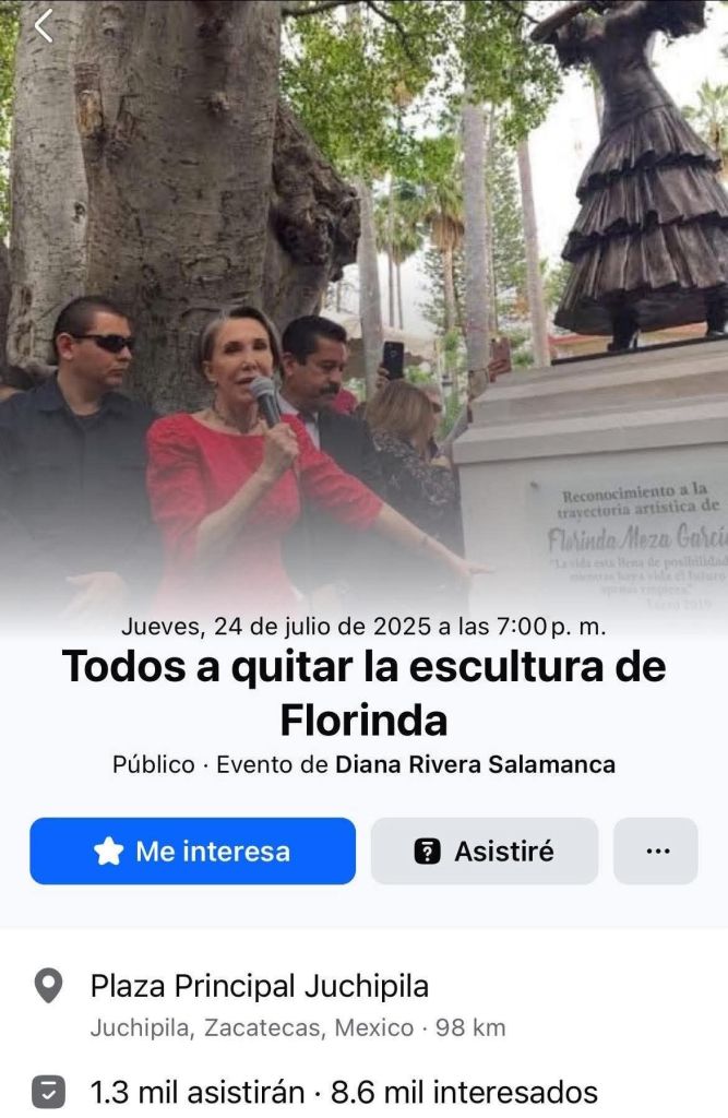 En la red social Facebook se ha creado un evento titulado “Todos a quitar la figura de Florinda”, convocando a la población de Juchipila para reunirse el próximo 24 de julio a las 6 de la tarde con el objetivo de retirar la escultura.
