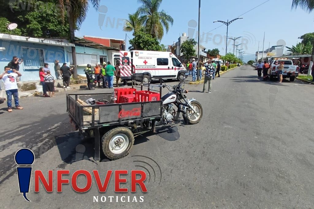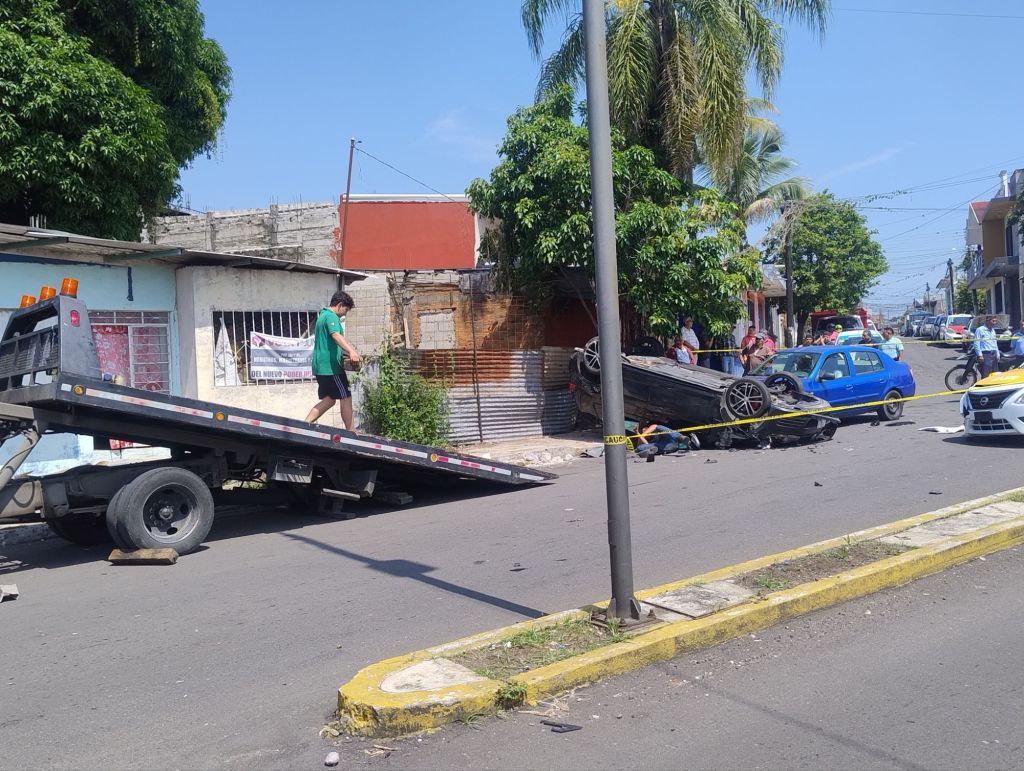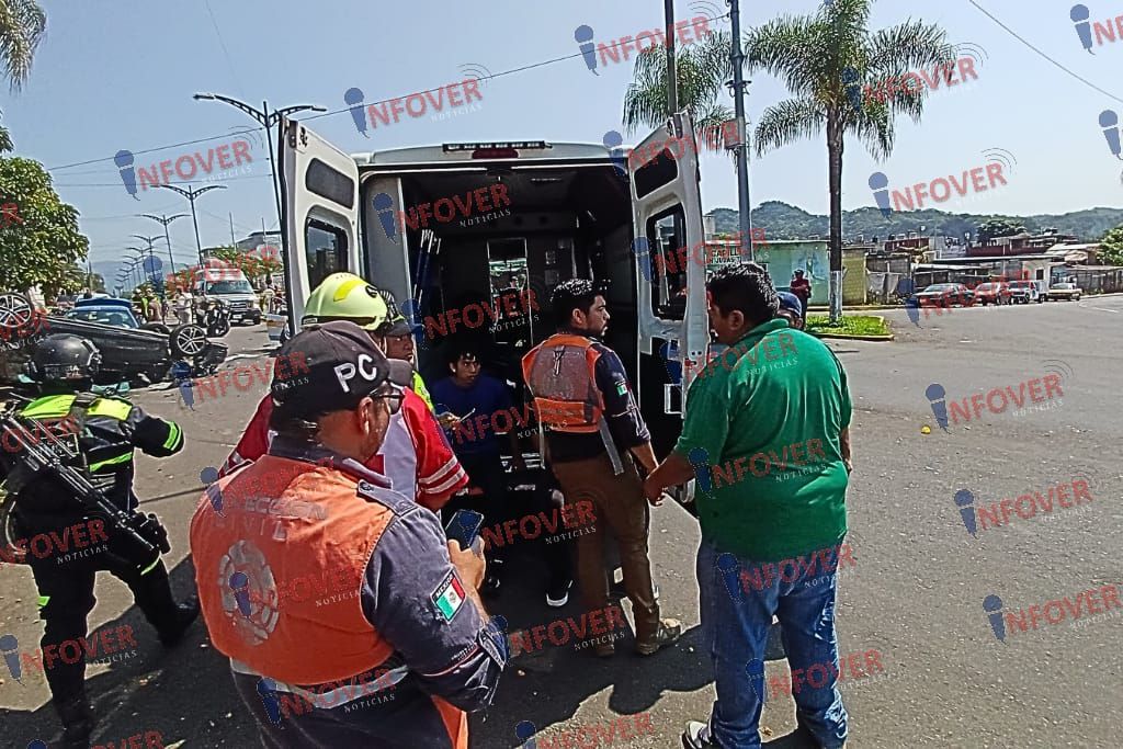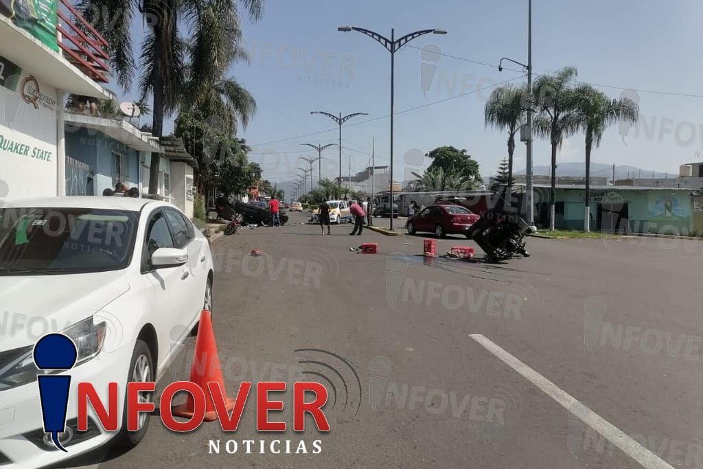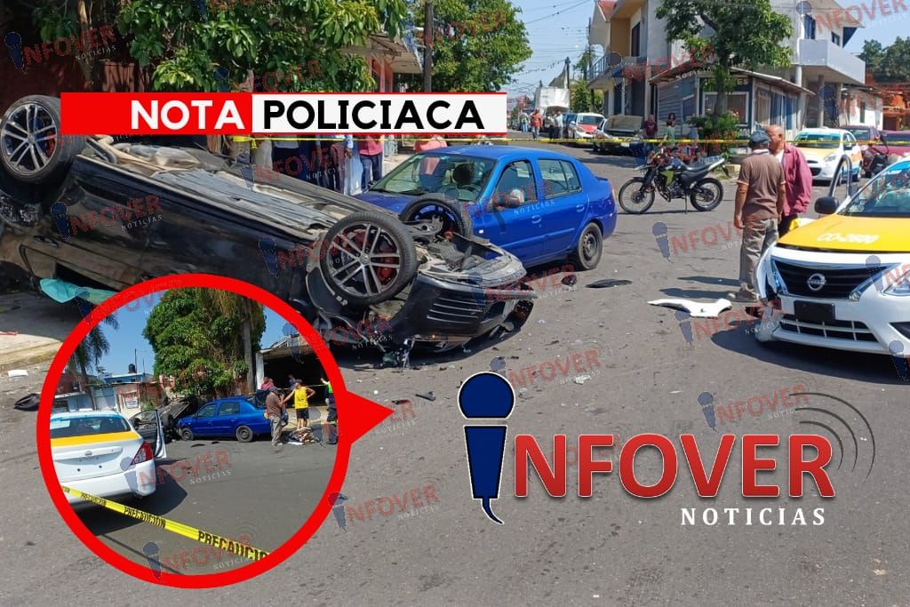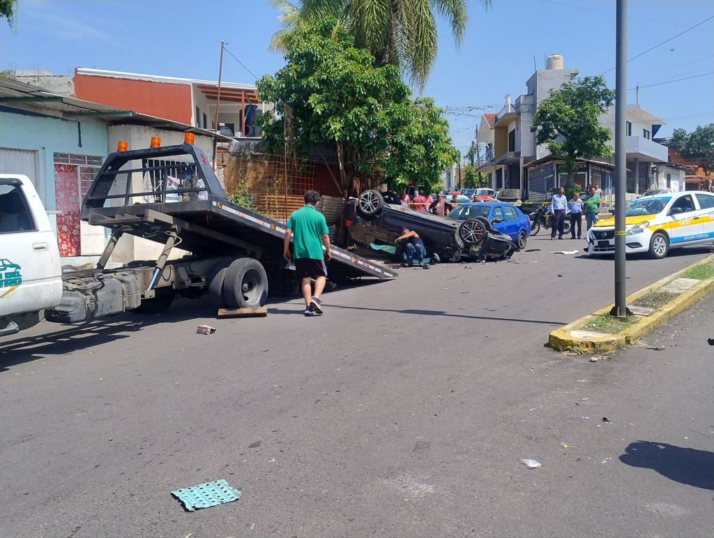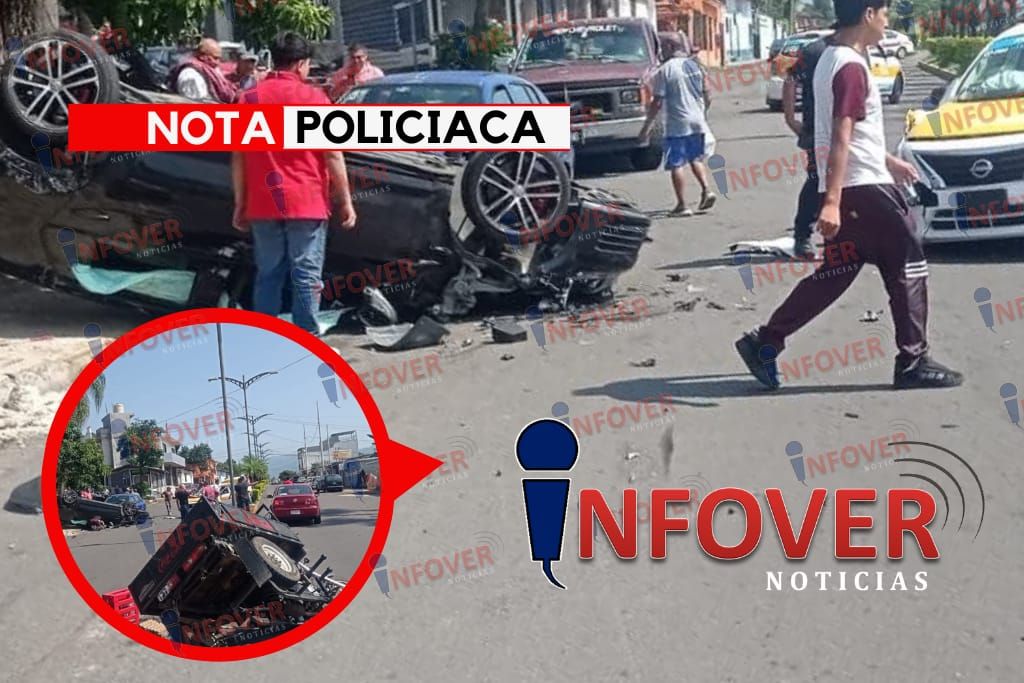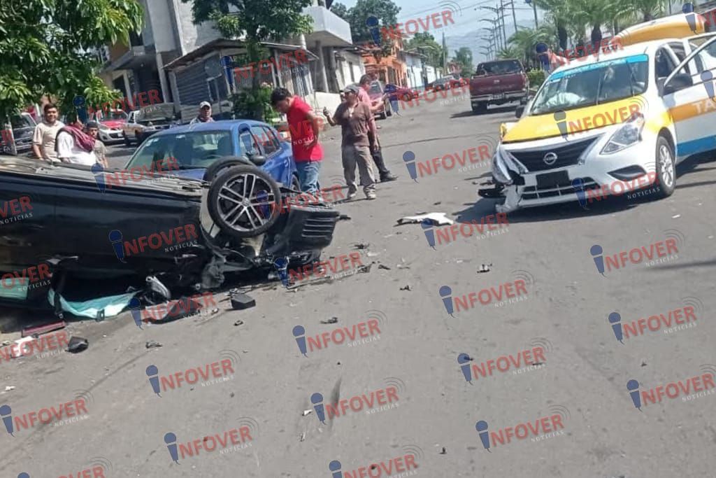 Córdoba, Ver – Un vehículo particular terminó volcado luego de chocar contra un taxi, con una motocicleta y un automóvil estacionado.