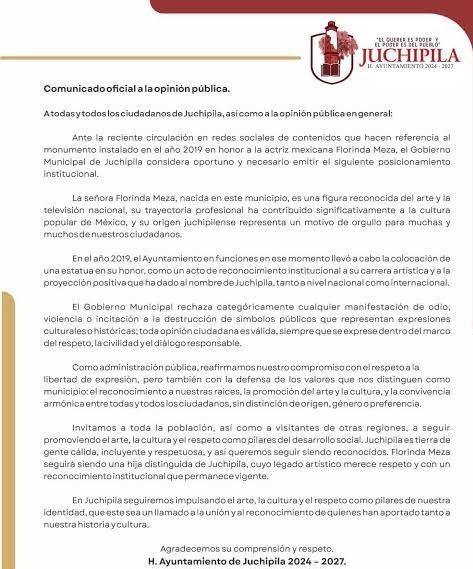 || El gobierno de Juchipila, Zacatecas, emitió un comunicado de prensa para externar su postura ante la solicitud del público de retirar «la estatua de la vergüenza», escultura en honor a Florinda Meza develada en 2019