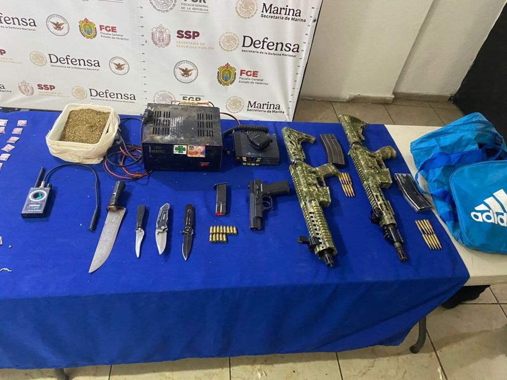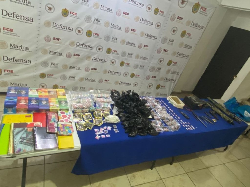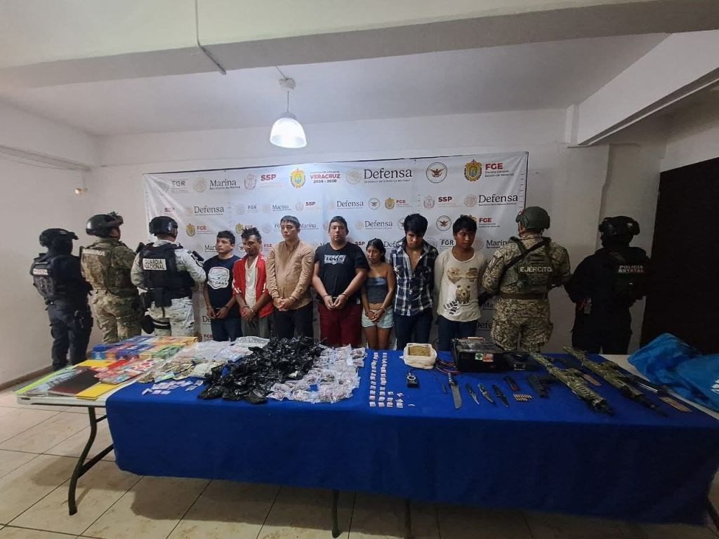 Asimismo, armamento y equipo táctico, sustancias ilícitas y fueron asegurados seis hombres y una mujer.