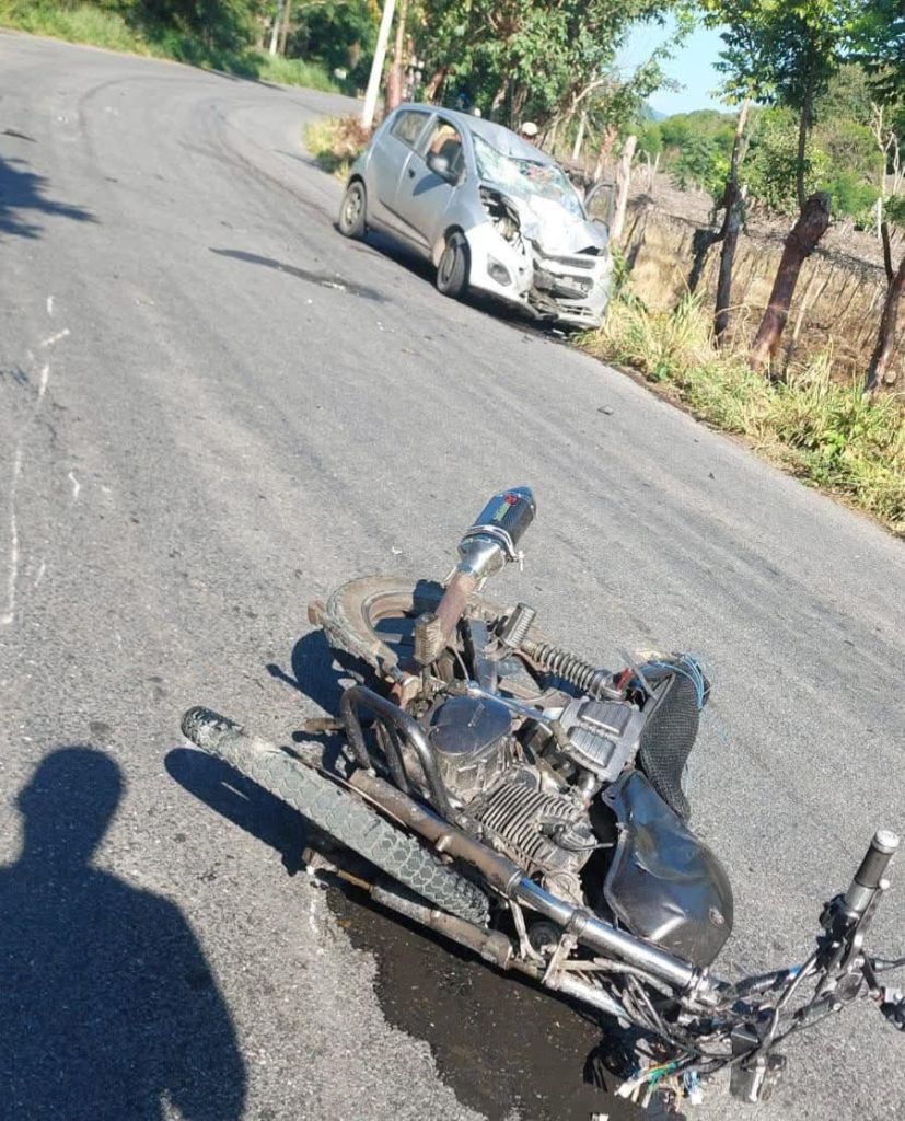 Por el fuerte impacto, la parte frontal y parabrisas del vehículo sufrieron severos daños, mientras que el conductor de la motocicleta resultó gravemente herido.