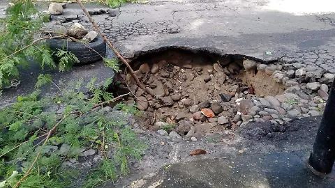 Socavón sobre Calzada Ignacio Zaragoza carriles laterales al poniente y Agua Caliente, colonia Agua Caliente, alcaldía Iztacalco.