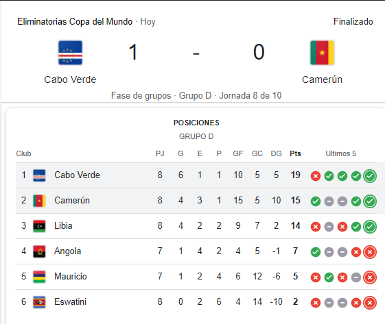 A falta de dos jornadas para el final, los Crioulos (actualmente 73° en el ranking FIFA) le sacaron 4 puntos a Camerún y buscarán hacer historia ante Libia (6/10) y Eswatini (13/10)”, reseñó el periodista Samuel Vargas, a través de su cuenta oficial de X.