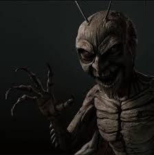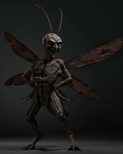 De su cabeza sobresalen antenas largas y huesudas, mientras que su espalda despliega un par de alas desgastadas. Además, sus manos son largas y delgadas, terminadas en garras puntiagudas.