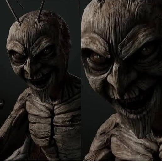 Su rostro conserva rasgos humanoides, pero deformados en una mueca siniestra: ojos hundidos y brillantes, una sonrisa malévola y dientes afilados que sugieren intenciones perversas.
