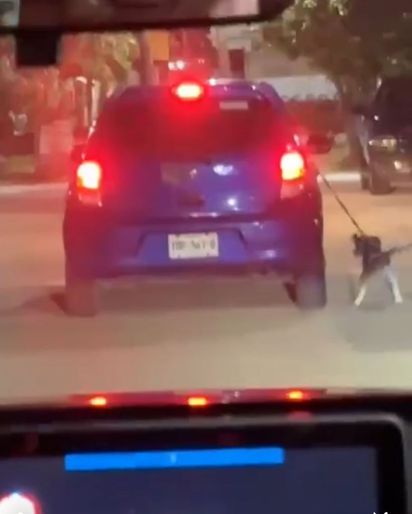 En el clip, que dura apenas 12 segundos, fue captado por testigos que se encontraban transitando en un auto atrás del de los violentadores en la colonia Las Palmas. En las imágenes se observa un auto azul metálico arrastrando a un perro mediano, de color blanco con café y negro, por la ventana.