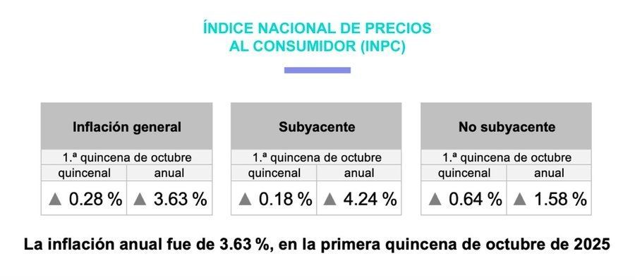 El Instituto Nacional de Estadística y Geografía (Inegi) reveló que la inflación general anual en México se ubicó en 3.63 por ciento durante la primera quincena de octubre de 2025.