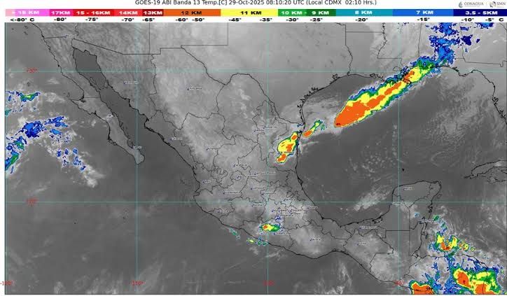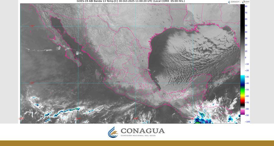 El Servicio Meteorológico Nacional (SMN) pronosticó para este jueves 30 de octubre de 2025 que el frente frío 11 se extenderá sobre la península de Yucatán, originando lluvias puntuales fuertes en Oaxaca (este), Chiapas (norte), Veracruz (región Olmeca), Tabasco (norte, este y oeste) y Campeche (oeste); chubascos en Puebla (región Tehuacán-Sierra Negra) y Veracruz (regiones Capital, Las Montañas y Los Tuxtlas); además de lluvias aisladas en Puebla (región Valle Serdán) y en zonas de Yucatán y Quintana Roo.